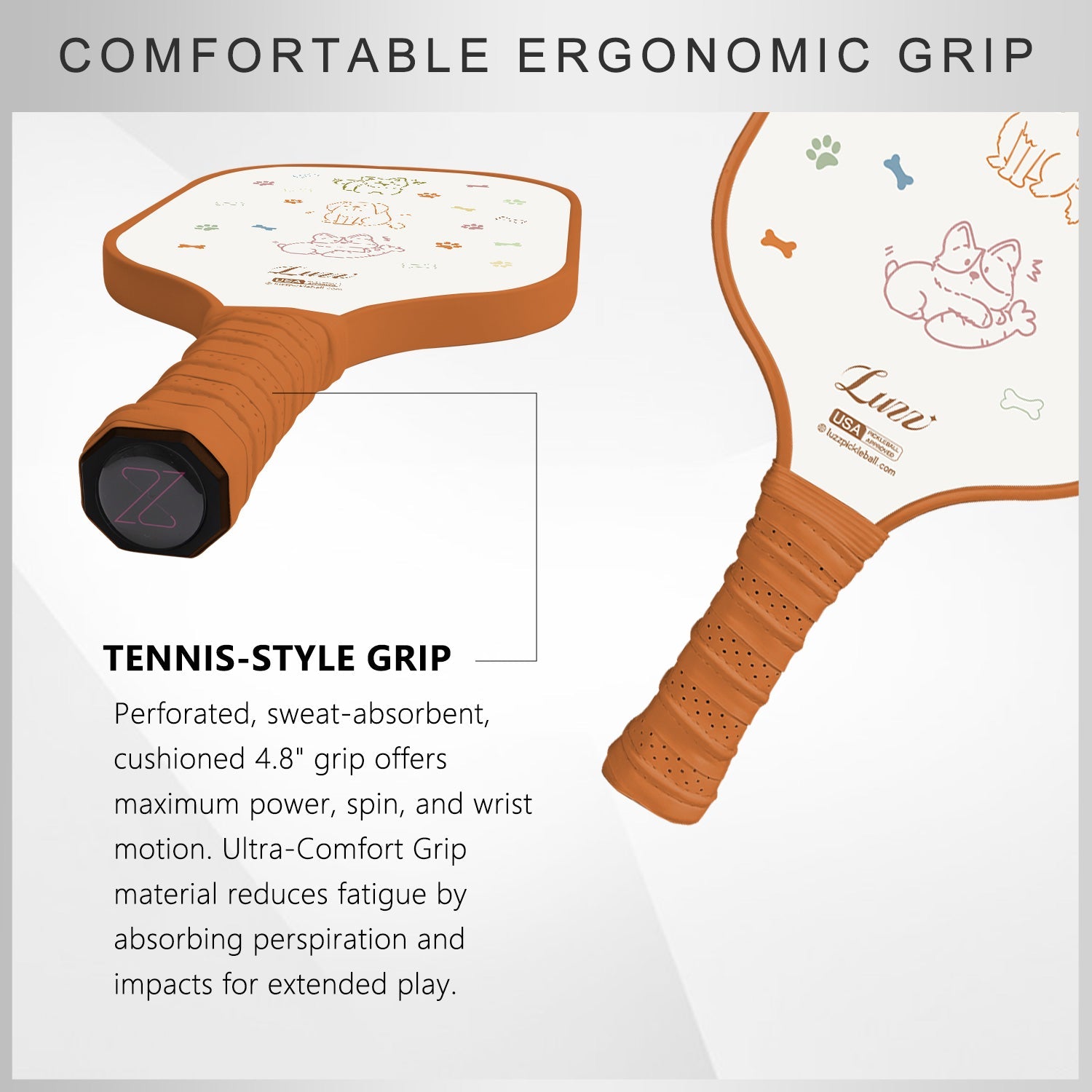 Wave goodbye to wrist fatigue with our ultra-comfortable ergonomic grip. It absorbs sweat and minimizes impact from the paddle surface, ensuring you stay comfortable and maintain grip throughout marathon matches.